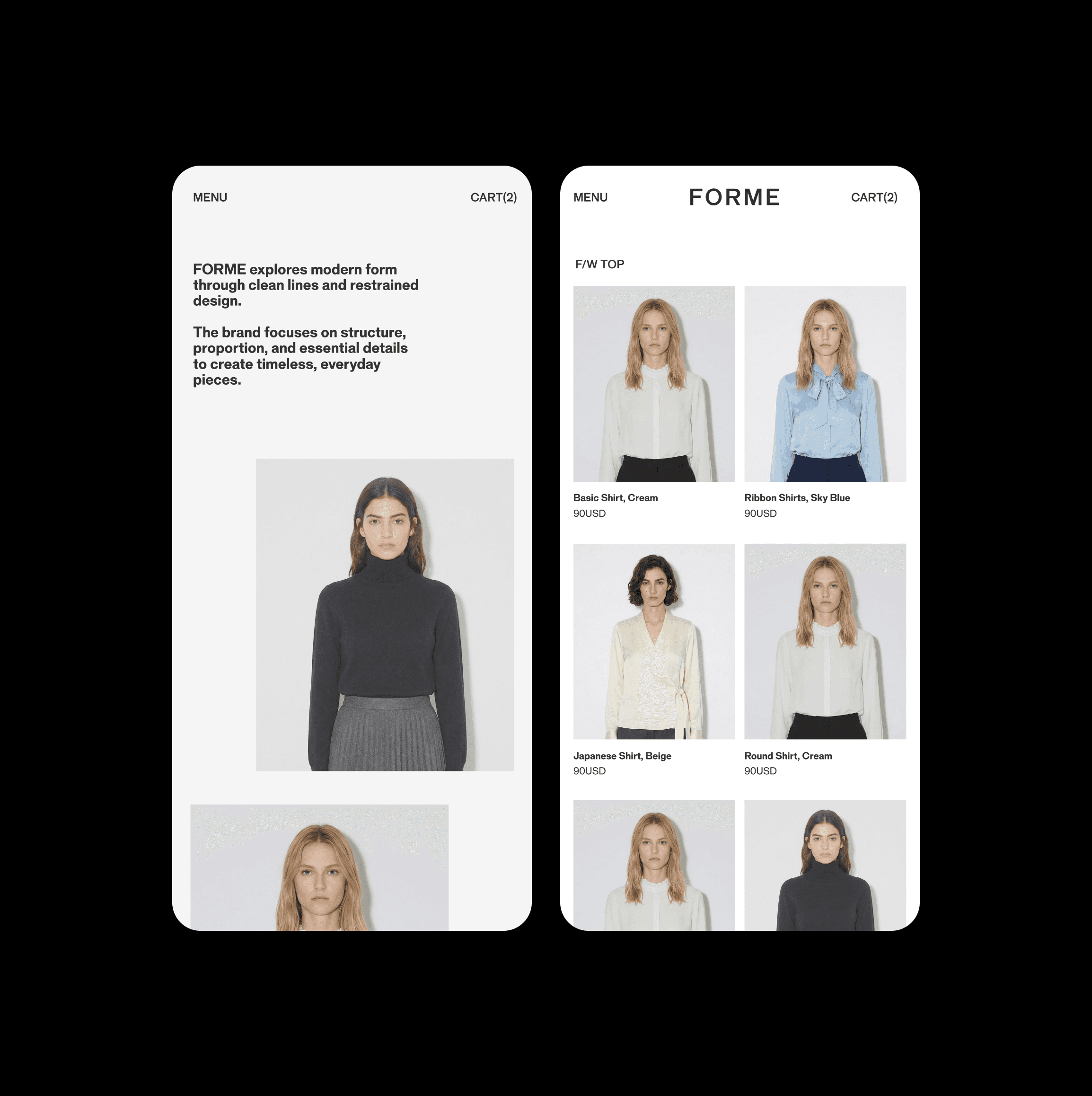 We developed a minimal brand identity and e-commerce experience for FORME. The design focuses on clarity, balance, and disciplined structure, creating a calm environment for presenting the collection. A restrained layout and simple grid system guide the shopping experience while allowing the garments and their form to remain the visual focus.