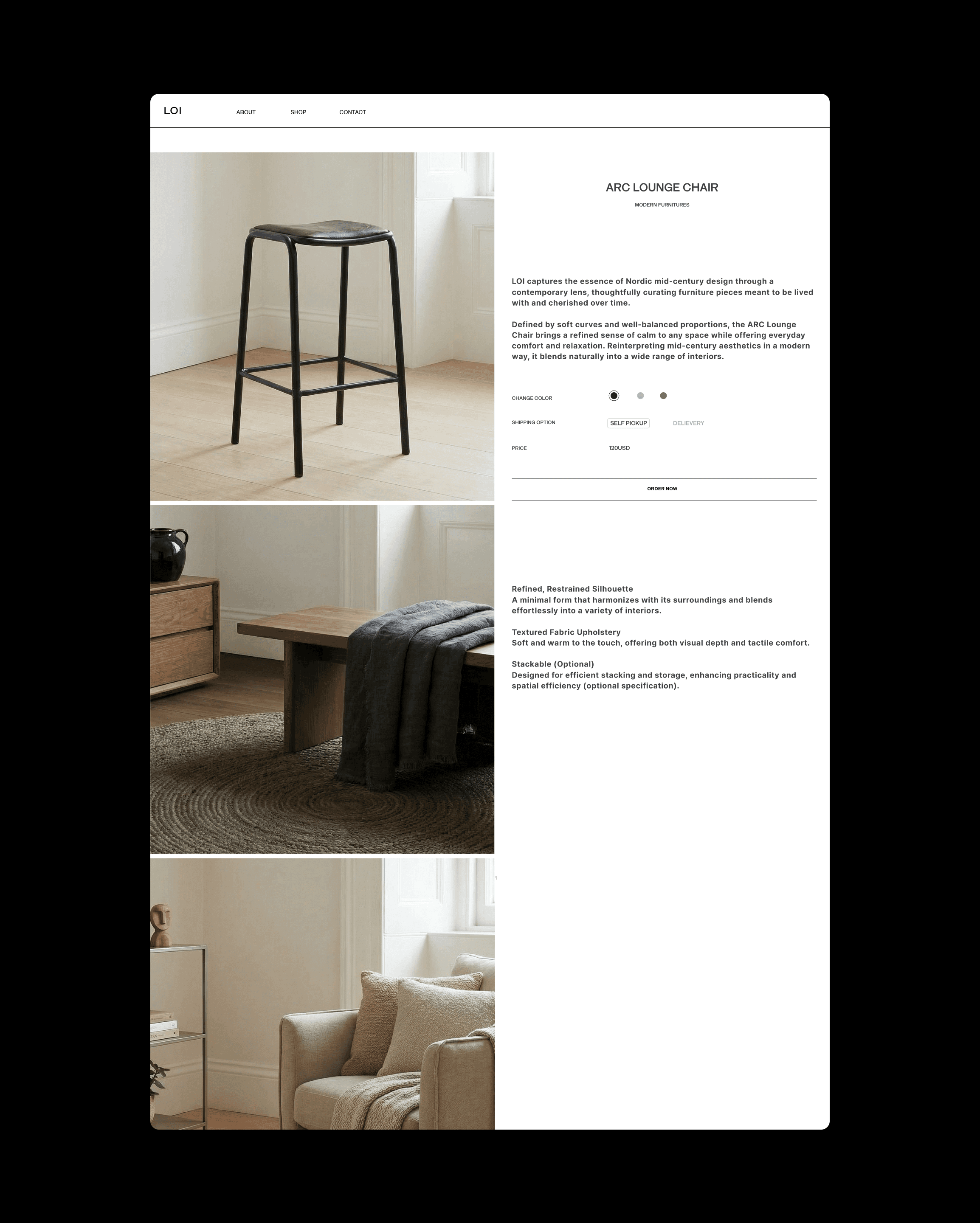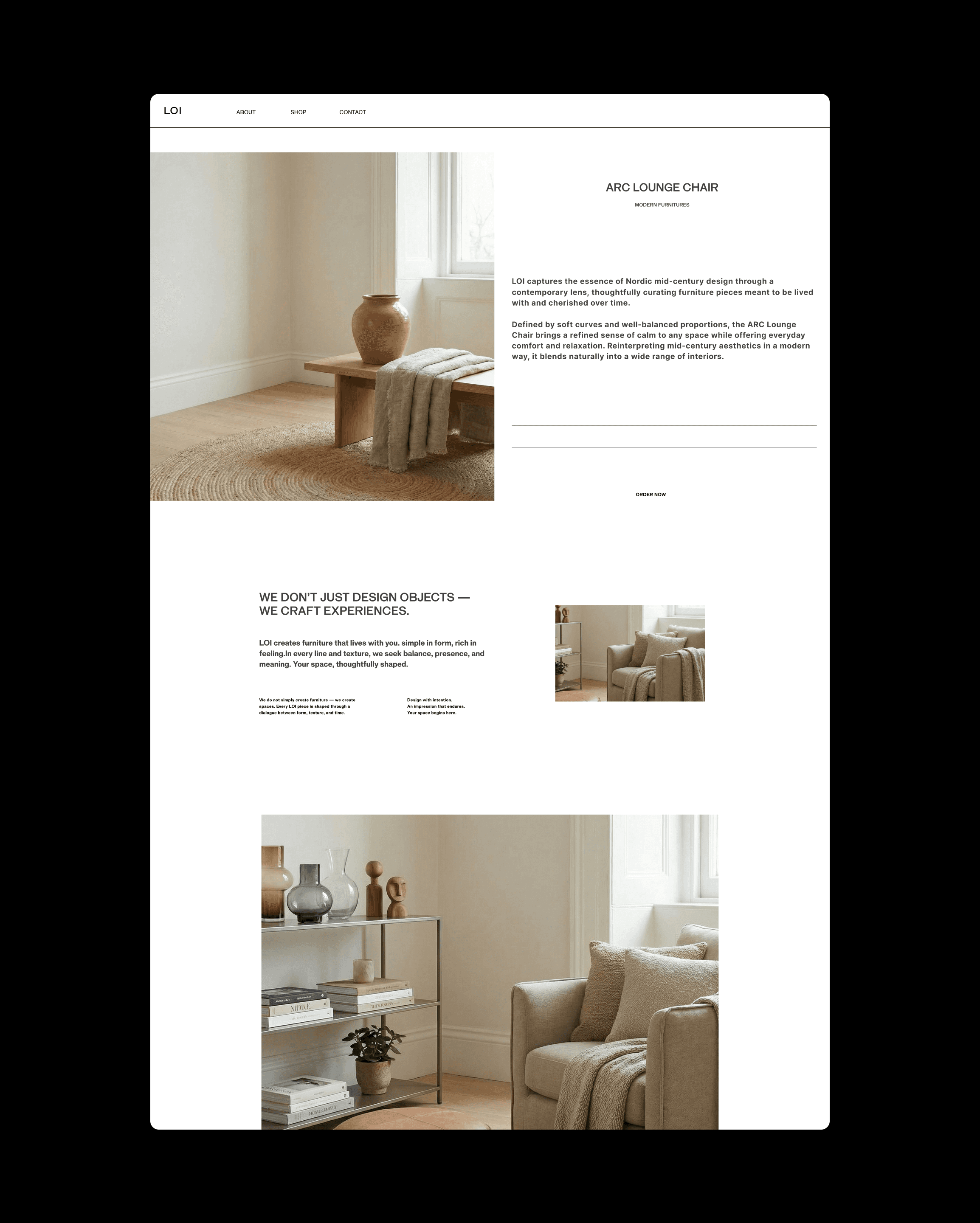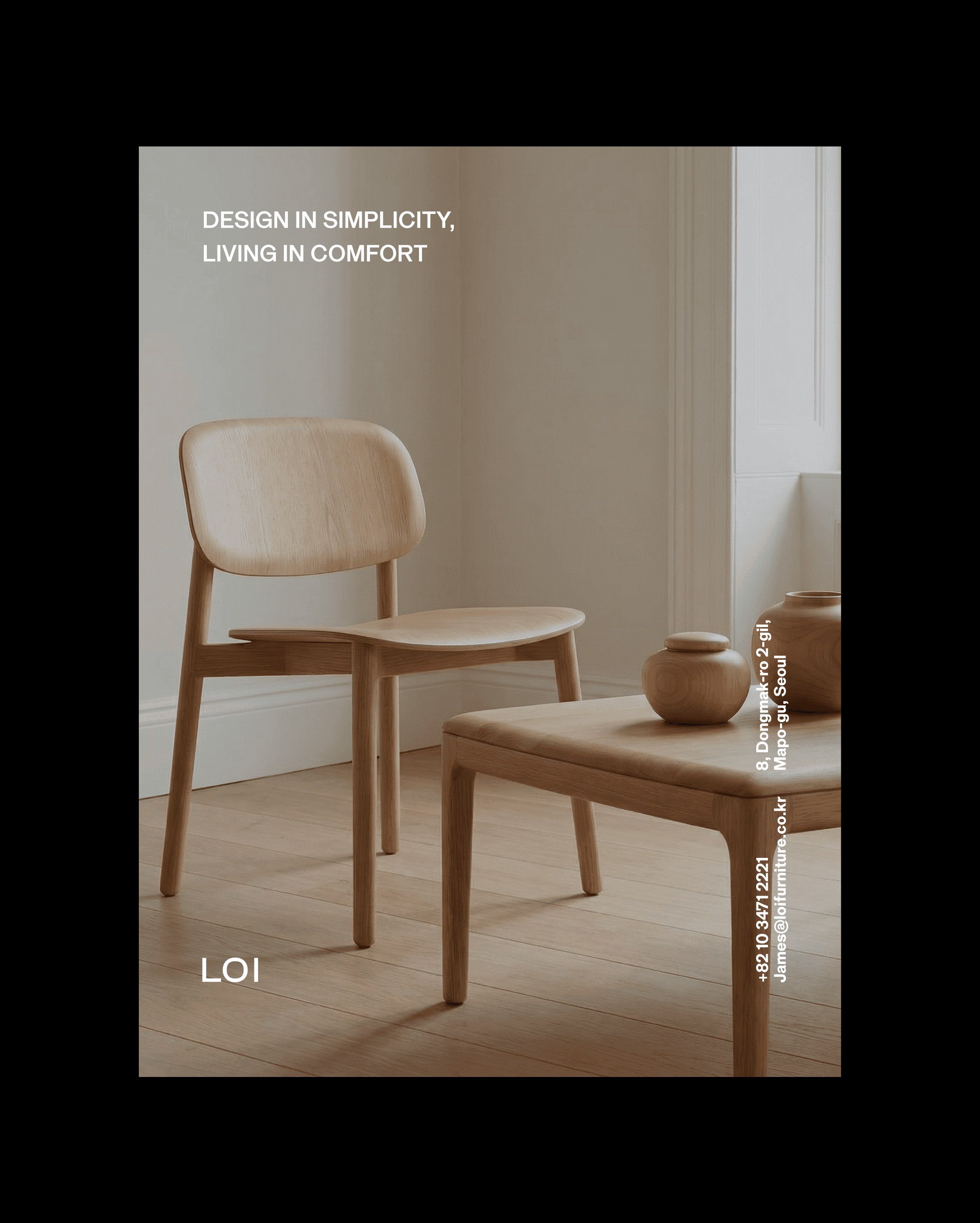 We developed the brand identity and e-commerce experience for LOI, a furniture brand centered on natural materials and calm living. The design focuses on clarity, proportion, and a disciplined grid system that brings order to the browsing experience. A warm and restrained presentation allows the textures and forms of the furniture to take visual priority, creating a digital environment that reflects the brand’s quiet sense of comfort.