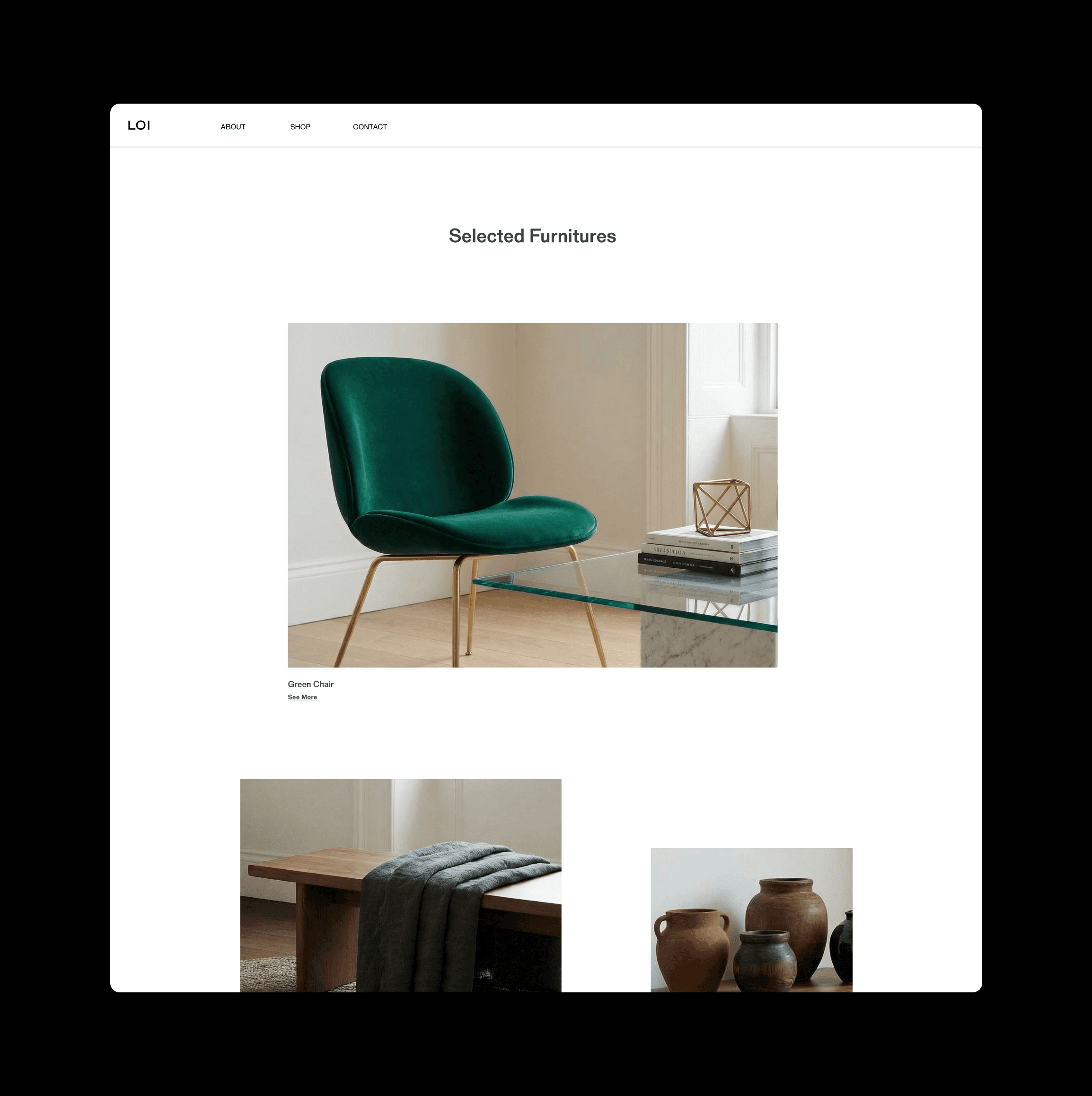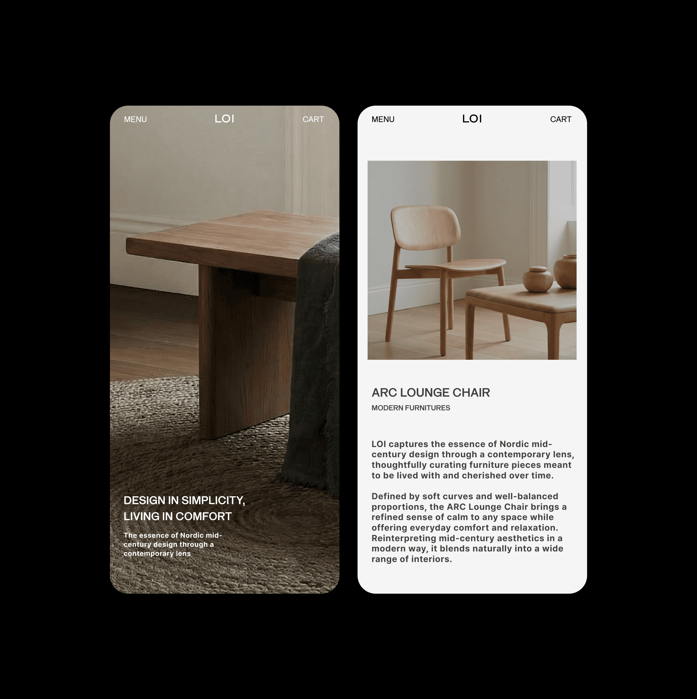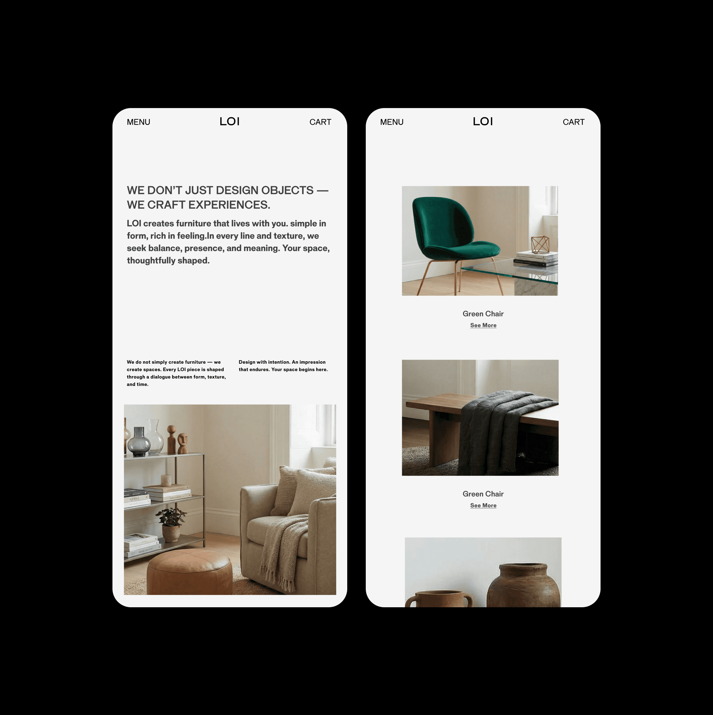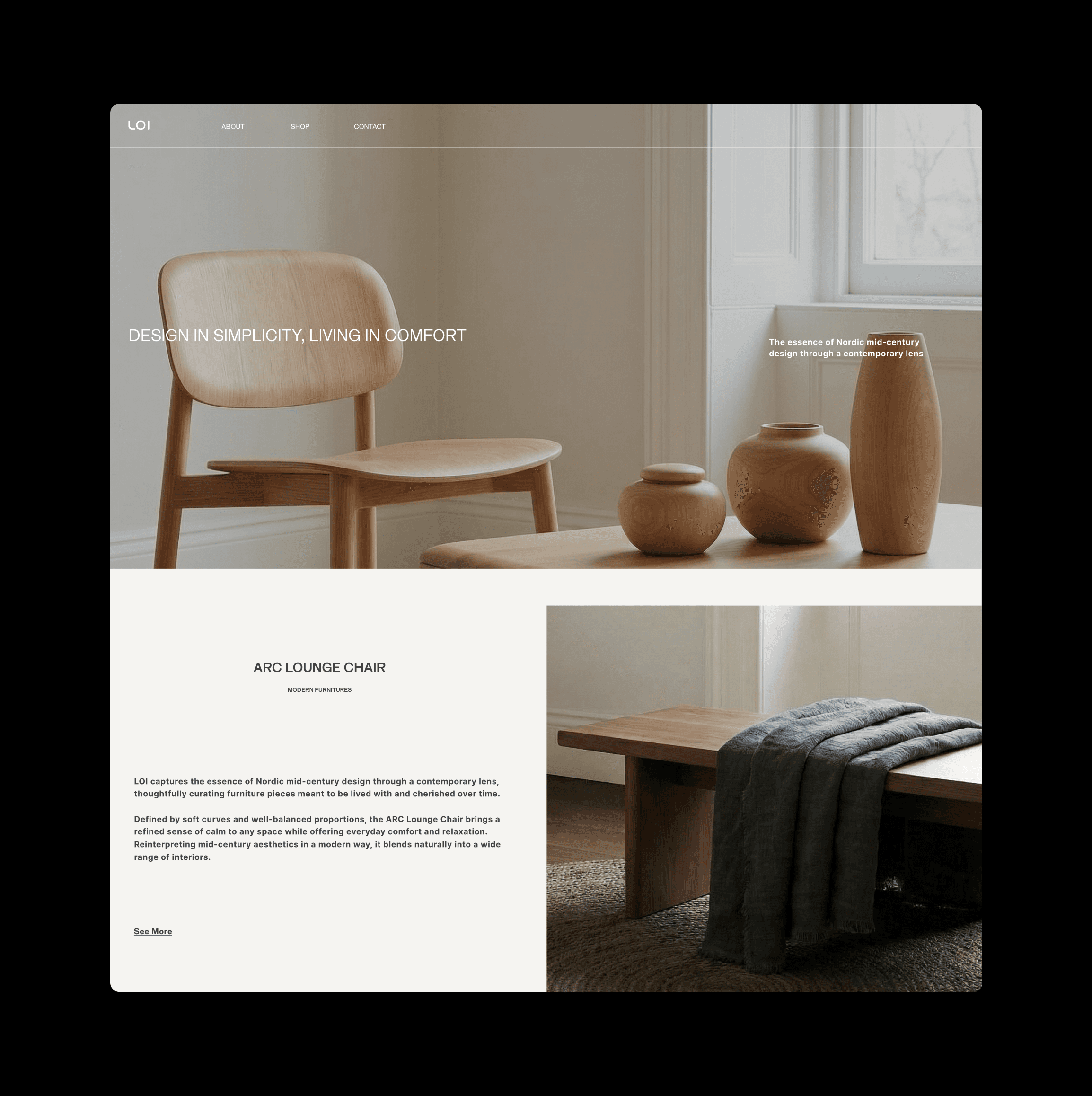 We developed the brand identity and e-commerce experience for LOI, a furniture brand centered on natural materials and calm living. The design focuses on clarity, proportion, and a disciplined grid system that brings order to the browsing experience. A warm and restrained presentation allows the textures and forms of the furniture to take visual priority, creating a digital environment that reflects the brand’s quiet sense of comfort.