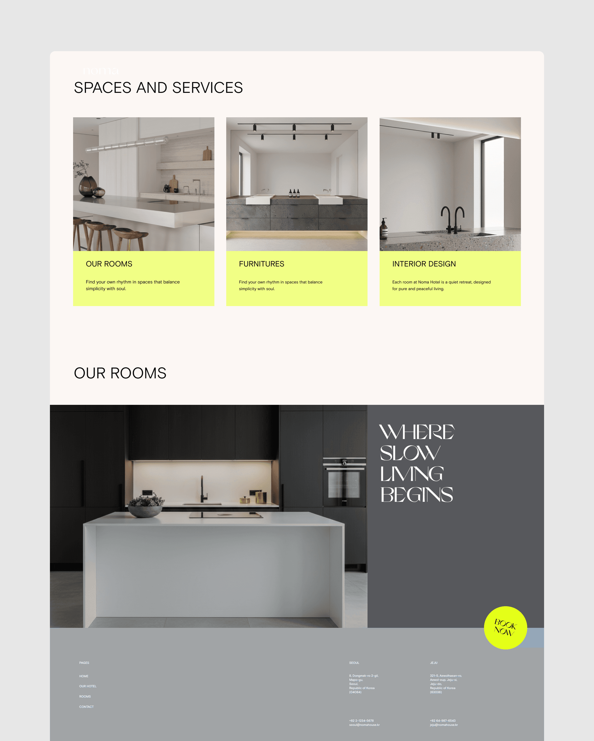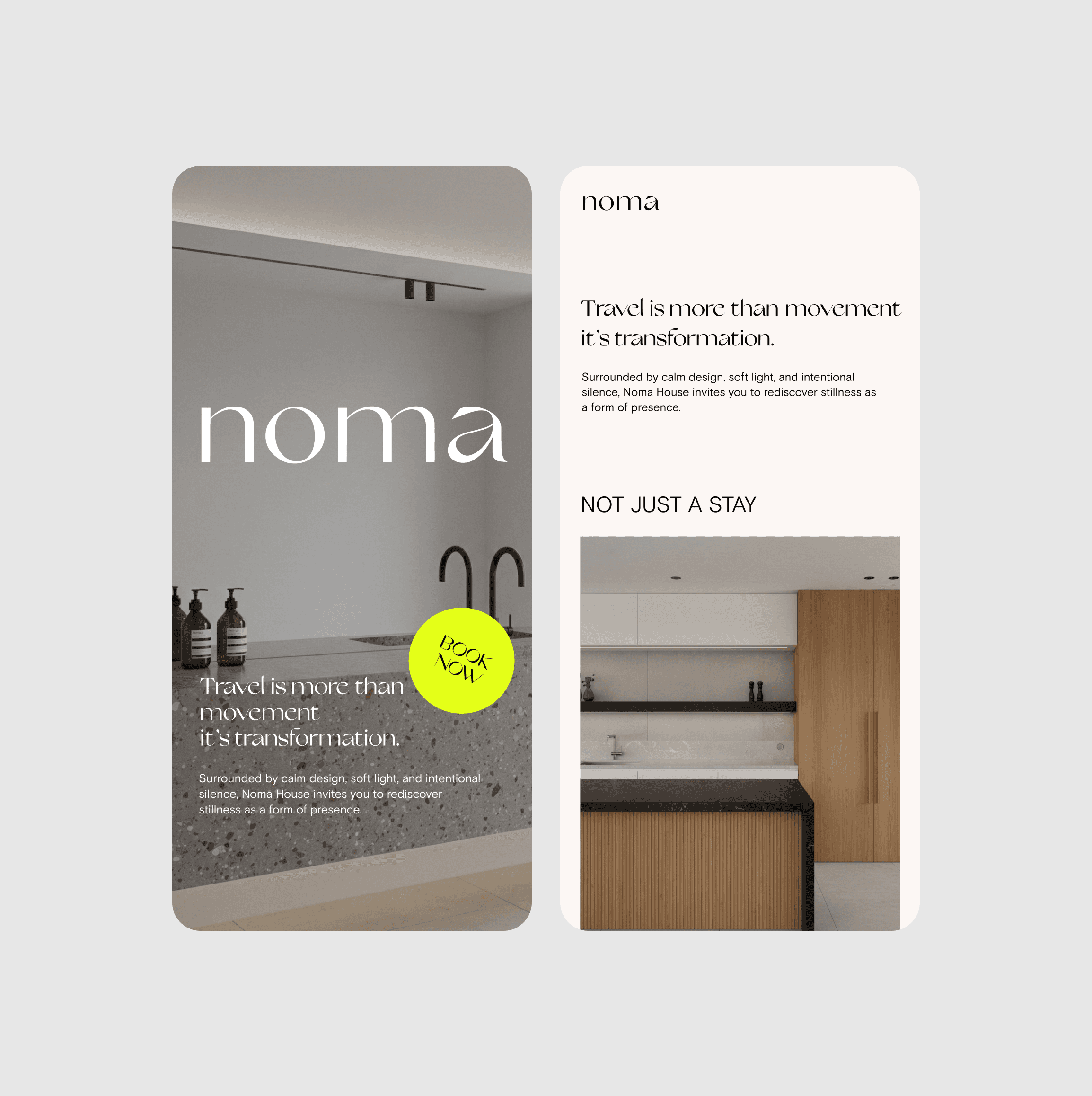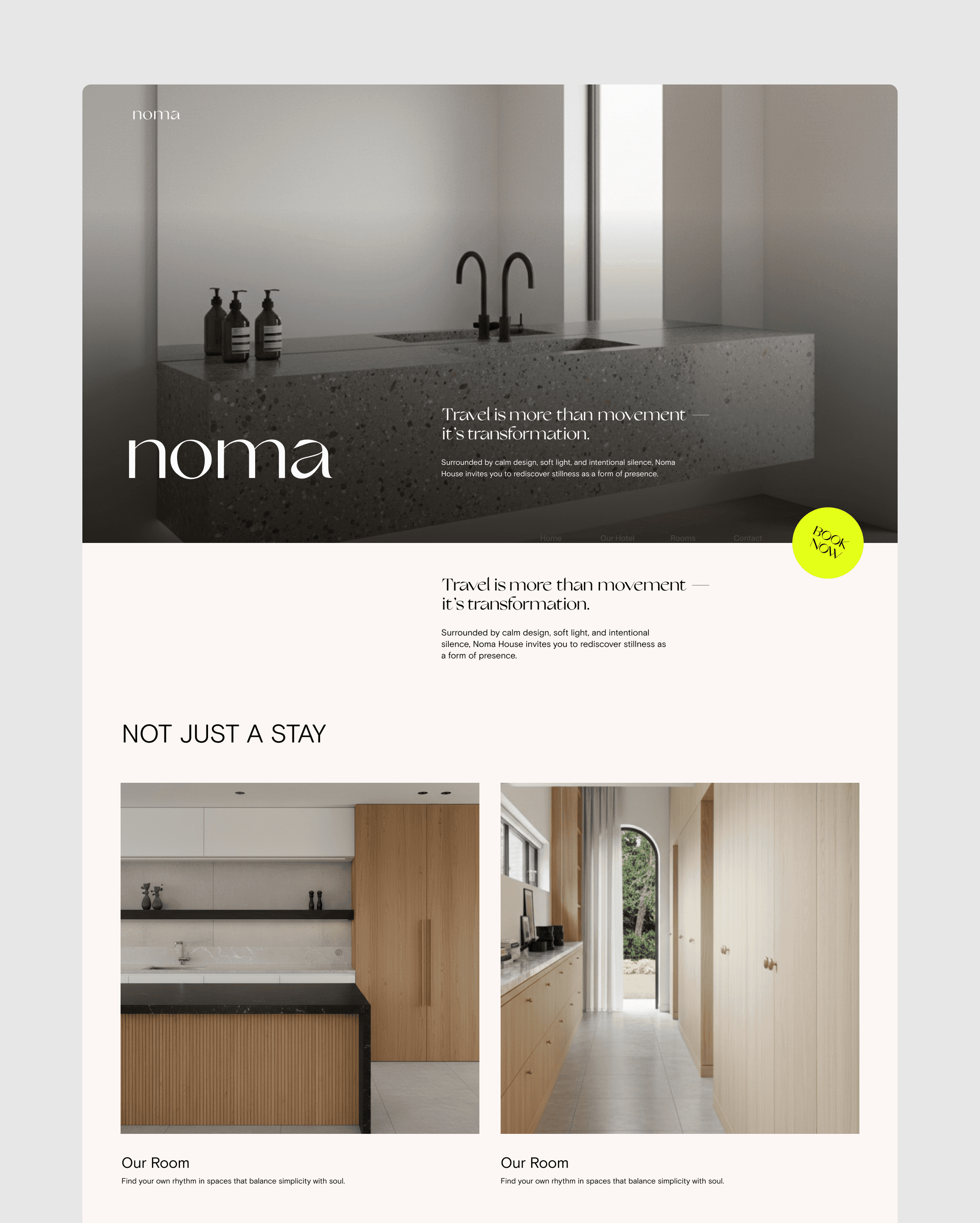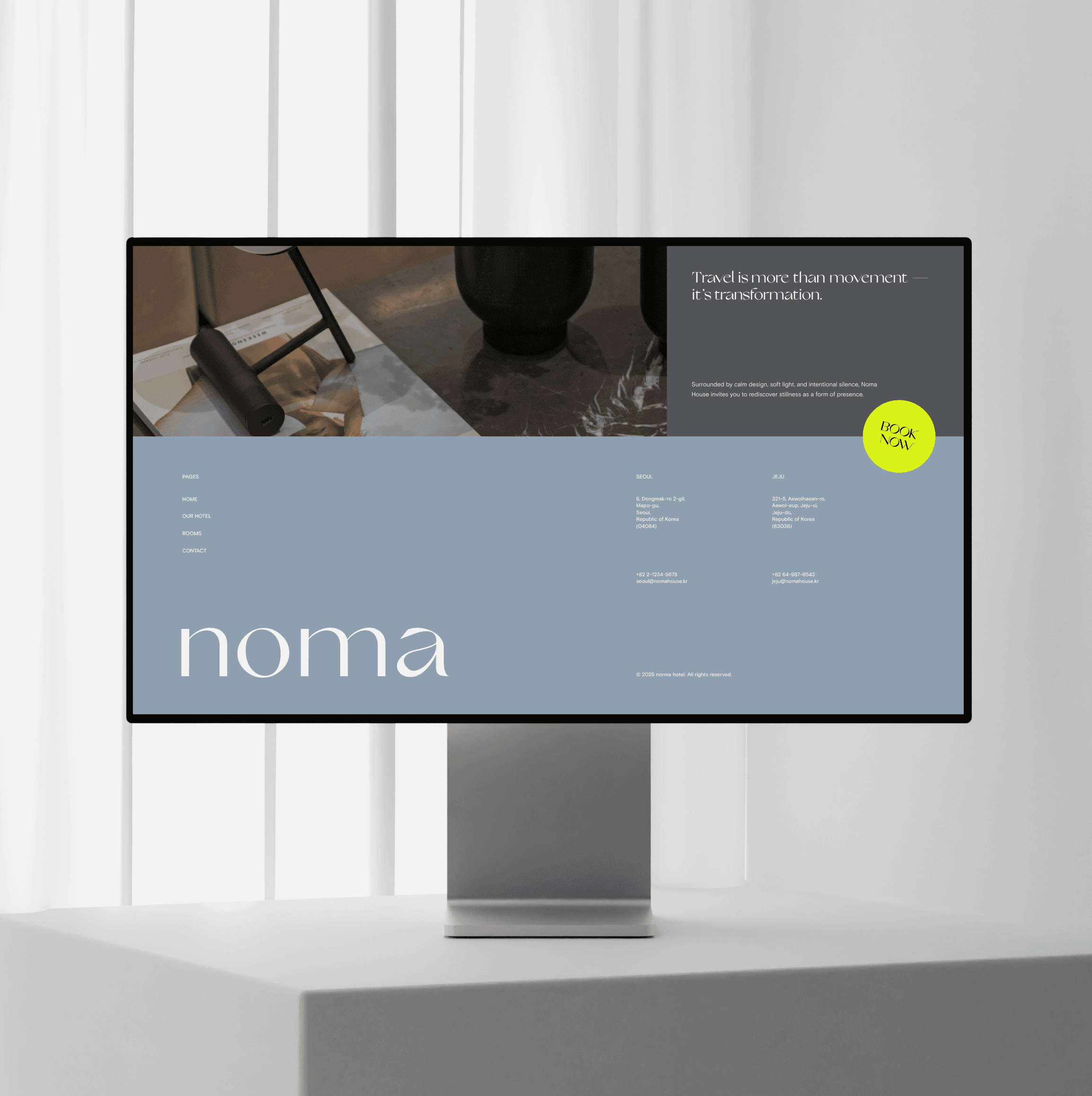 We developed the brand identity and digital experience for Noma Hotel, a boutique stay defined by calm living and thoughtful hospitality. The design focuses on soft visual tones, minimal composition, and a clear structure that reflects the hotel’s serene atmosphere. Gentle pacing and refined imagery create a digital environment that mirrors the quiet comfort of the physical space.