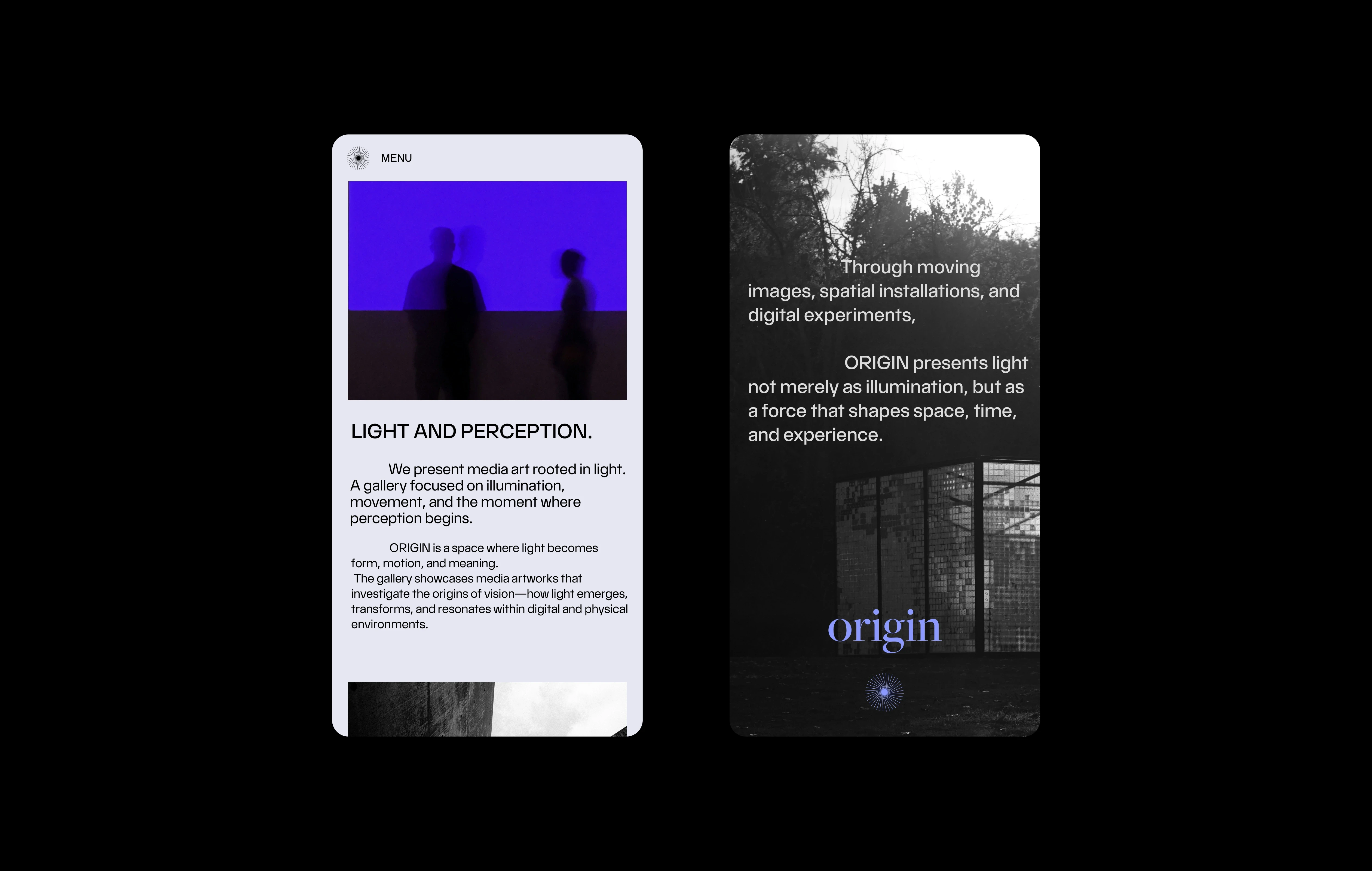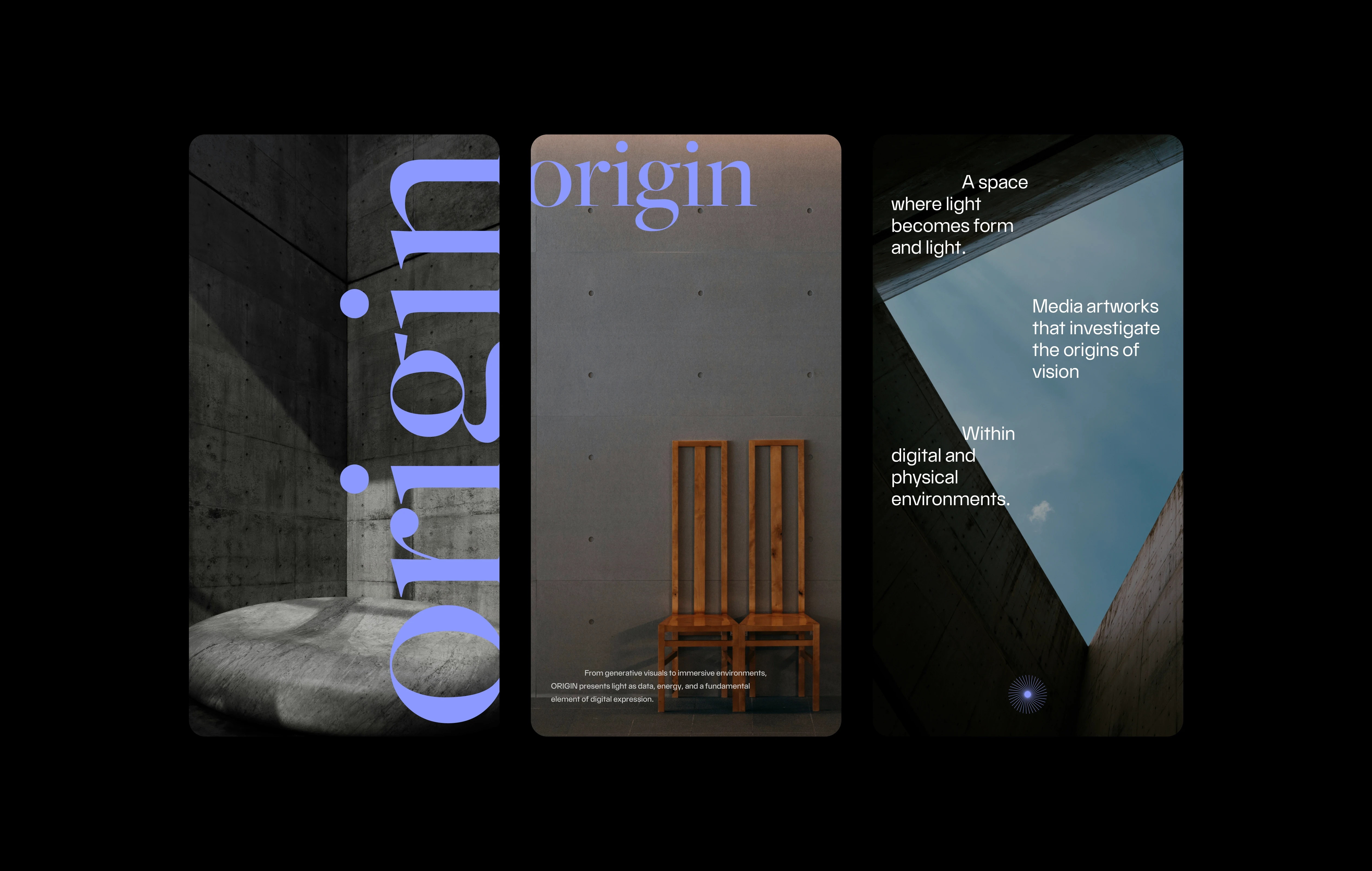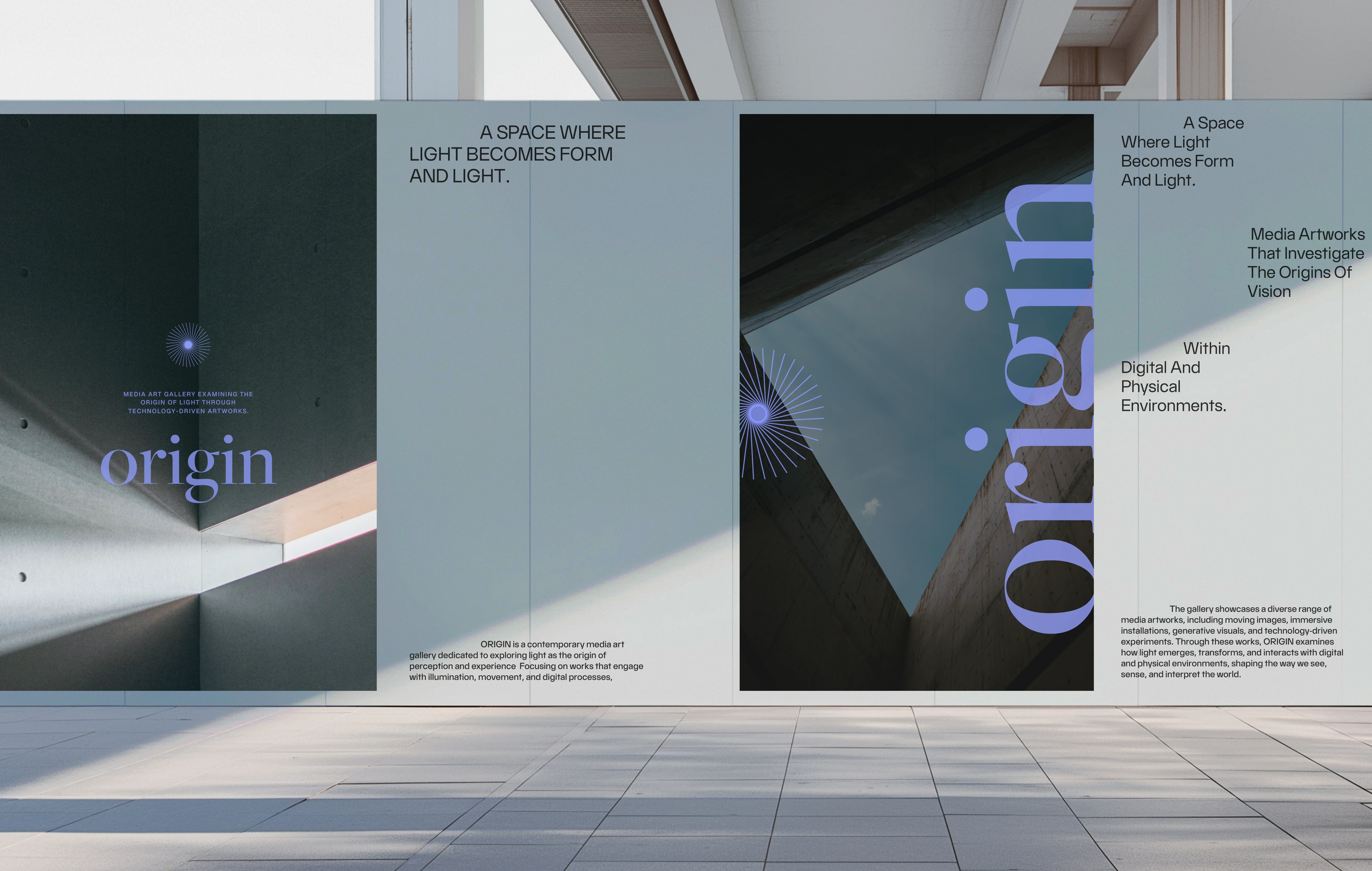 A visual identity project for ORIGIN, a media art gallery that explores the point where light transforms into perception.